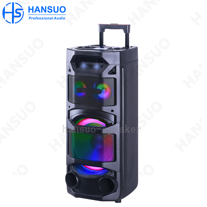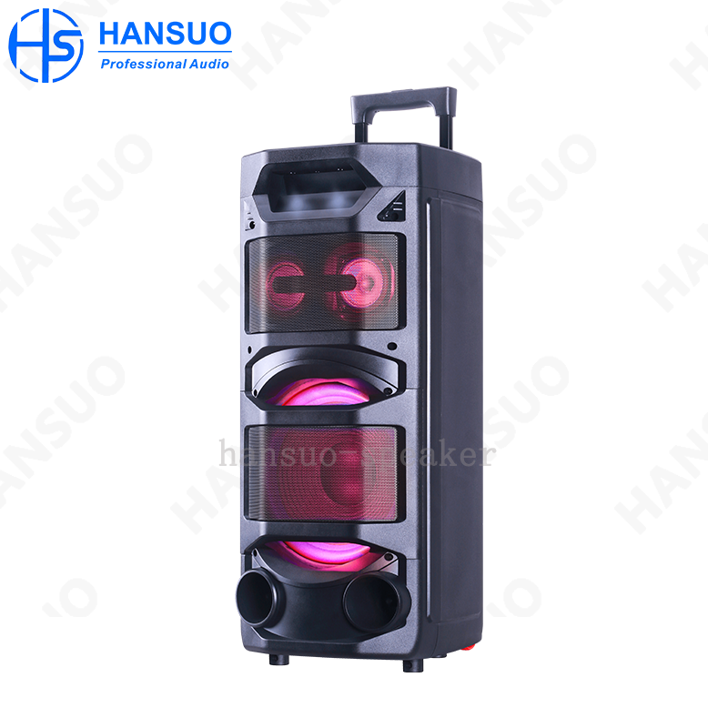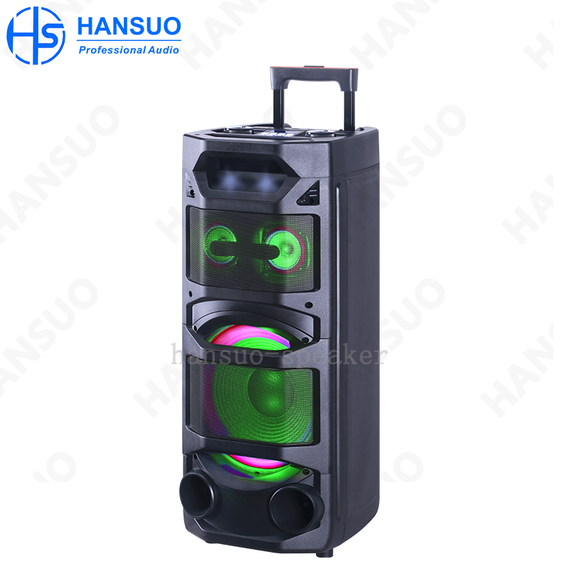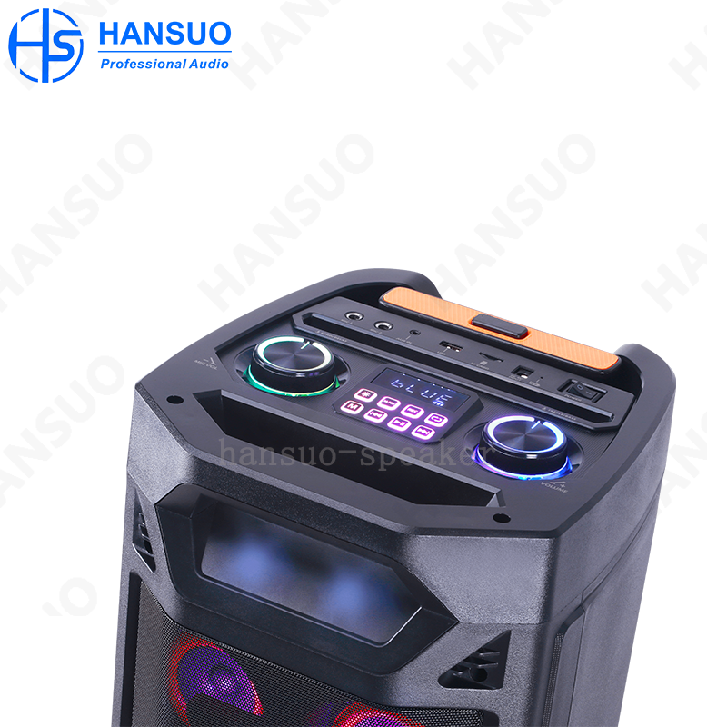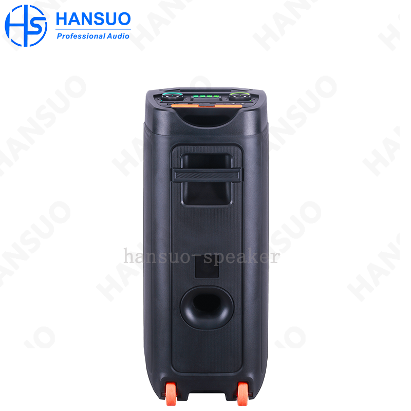 The HANSUO HS-TS10V6 is a high-performance trolley speaker with an exclusive private model design, manufactured directly by HANSUO. Featuring adjustable power output of 60W/80W, it adopts a professional acoustic configuration consisting of a single 10-inch premium woofer and double tweeters, delivering powerful and layered sound performance. The 10-inch large-diameter woofer ensures deep, resonant bass with strong penetration, while the dual tweeters reproduce clear, bright high notes and delicate vocal details, creating an immersive listening experience. Designed with mobility as a core advantage, it is equipped with a retractable trolley and smooth-rolling wheels, paired with an ergonomic handle, enabling effortless transportation even across long distances, making it perfect for outdoor events, street performances, family gatherings, commercial promotions, and school activities. Crafted from high-quality durable plastic, the speaker combines sturdiness with a sleek appearance, capable of withstanding the rigors of outdoor use and frequent transportation.