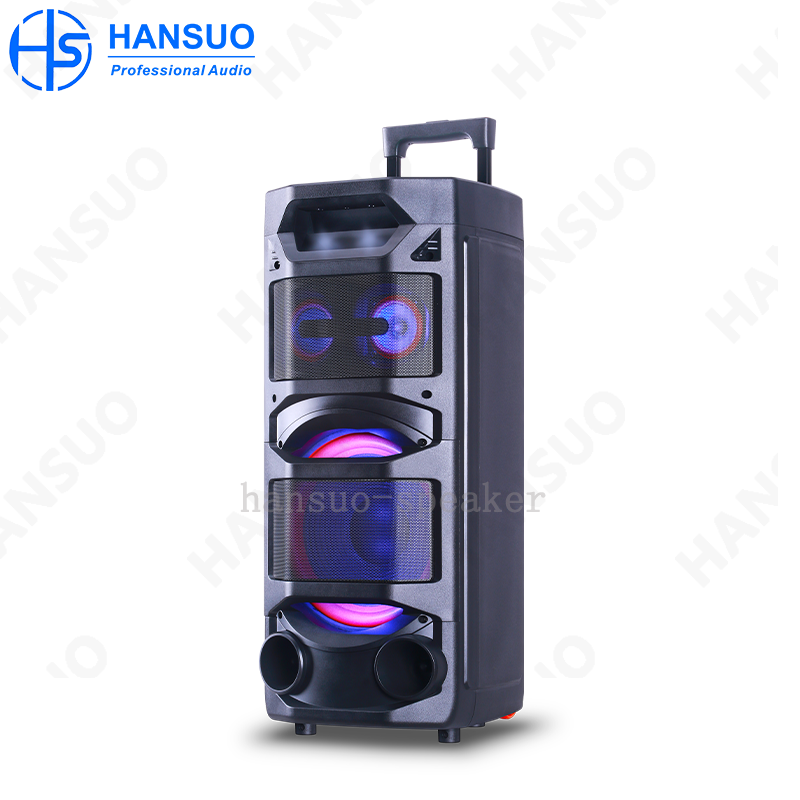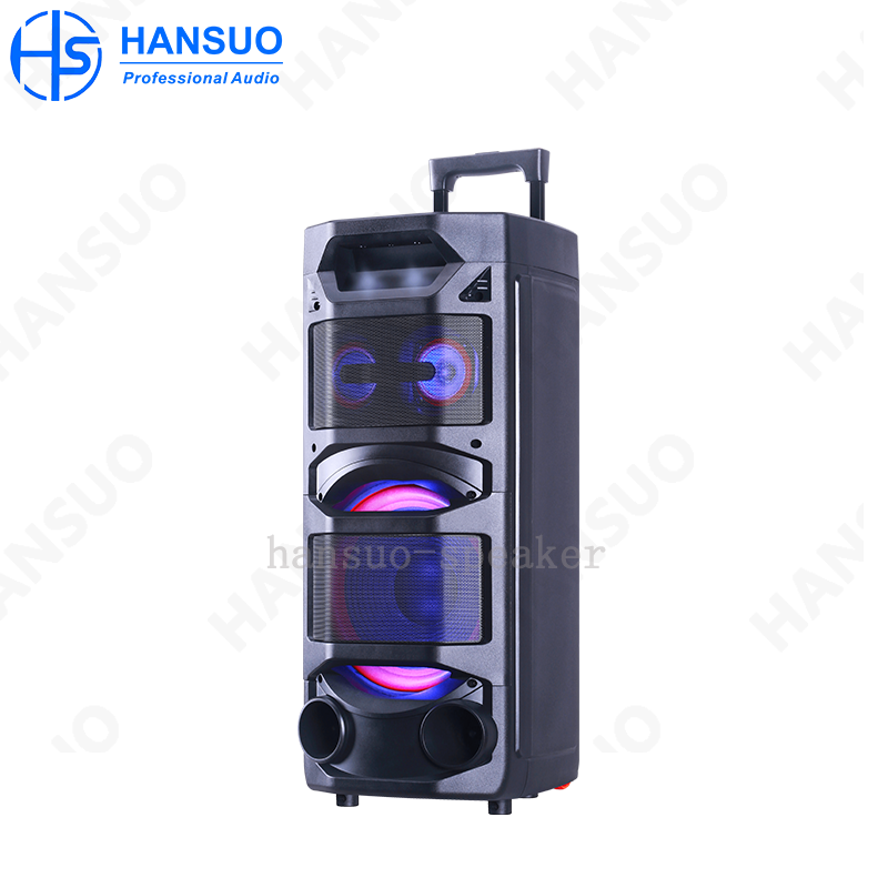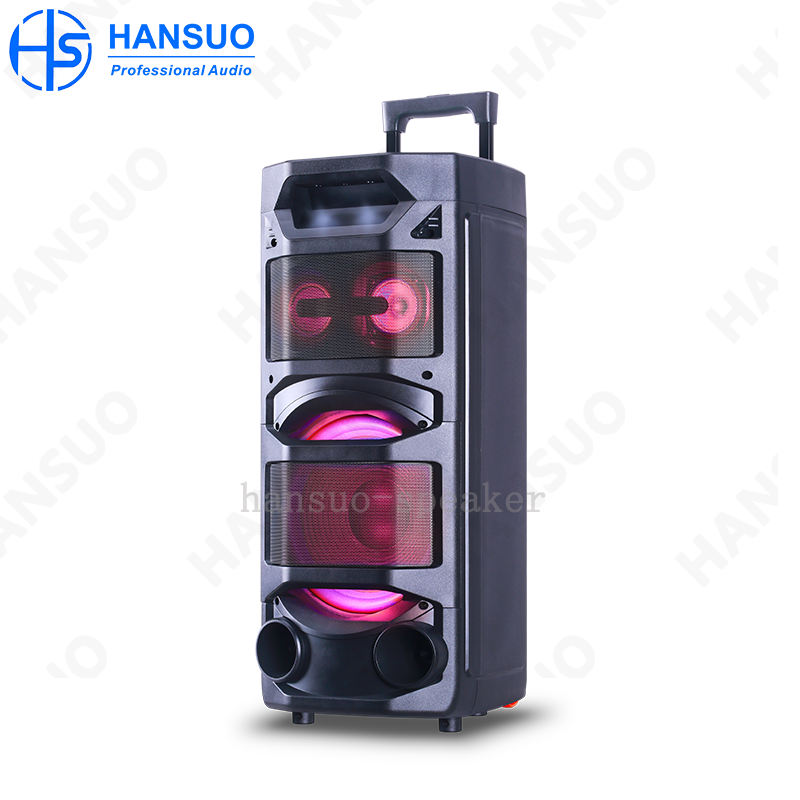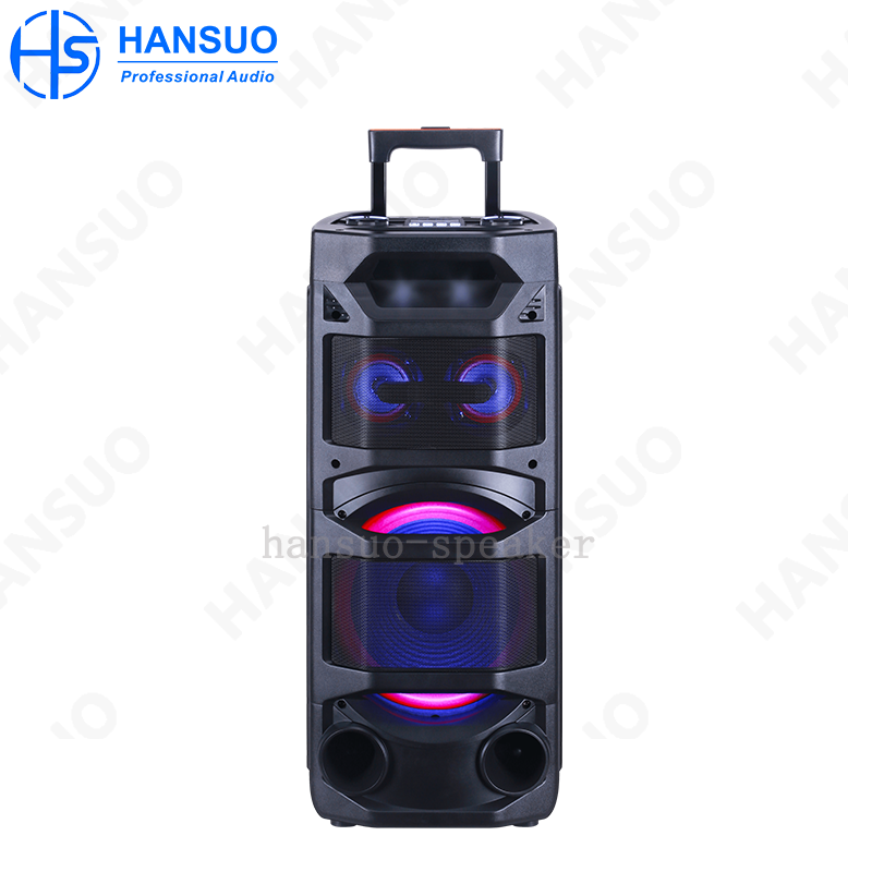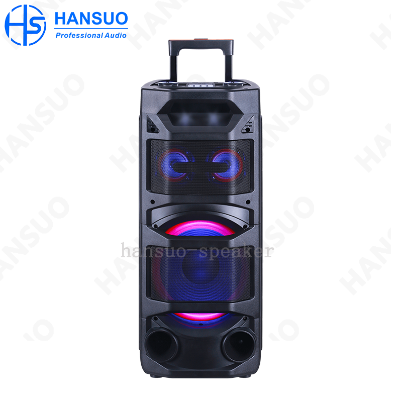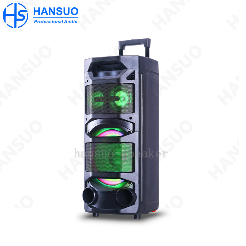 The HANSUO HS-TS10V6 is a high-performance trolley speaker with an exclusive private model design, manufactured directly by HANSUO. Featuring adjustable power output of 60W/80W, it adopts a professional acoustic configuration consisting of a single 10-inch premium woofer and double tweeters, delivering powerful and layered sound performance. The 10-inch large-diameter woofer ensures deep, resonant bass with strong penetration, while the dual tweeters reproduce clear, bright high notes and delicate vocal details, creating an immersive listening experience. Designed with mobility as a core advantage, it is equipped with a retractable trolley and smooth-rolling wheels, paired with an ergonomic handle, enabling effortless transportation even across long distances, making it perfect for outdoor events, street performances, family gatherings, commercial promotions, and school activities. Crafted from high-quality durable plastic, the speaker combines sturdiness with a sleek appearance, capable of withstanding the rigors of outdoor use and frequent transportation.